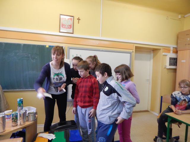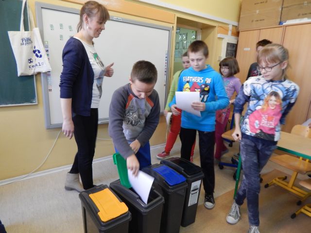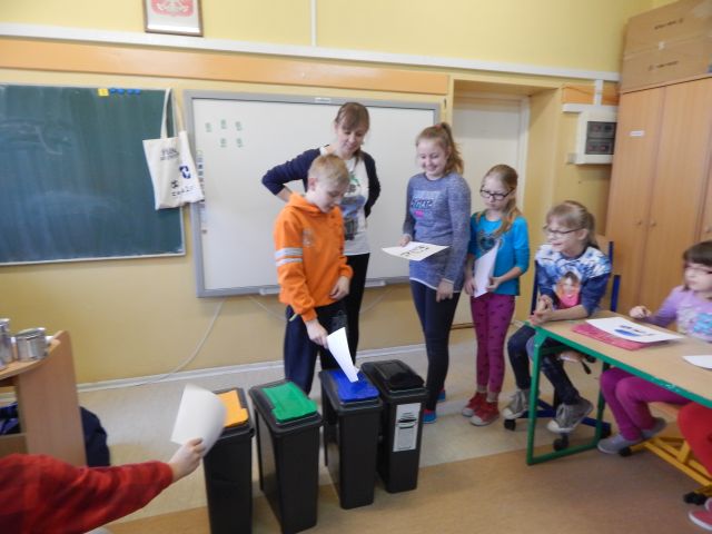W dniu 10.03.2015 roku odbyła się w Naszej szkole prelekcja dla klas IV-VI na temat segregacji odpadów. W czasie spotkania uczniowie wyrabiali i utrwalali prawidłowe nawyki postępowania z odpadami, opakowaniami, niebezpiecznymi i biodegradowalnymi, ćwiczyli praktyczne segregowanie odpadów.
