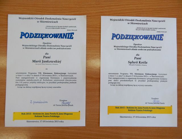 W dniach 17-18 kwietnia 2015r. w Specjalnym Ośrodku Szkolno-Wychowawczym im. Janusza Korczaka w Skierniewicach odbył się VII Kiermasz Edukacyjny pod hasłem ,,Sześciolatek w klasie I i co dalej?". Patronat honorowy nad VII. Kiermaszem Edukacyjnym objął Marszałek Województwa Łódzkiego – Pan Witold Stępień. Organizatorem imprezy był Wojewódzki Ośrodek Doskonalenia Nauczycieli w Skierniewicach. Podczas tegorocznego Kiermaszu uczestnicy mogli wymieniać informacje i opinie na temat ważnych problemów współczesnej edukacji. Istotnym elementem Kiermaszu były także konferencje, warsztaty, seminaria, prezentacje wydawnicze, konsultacje i wystawy. Stoisko promujące prace dzieci z naszej szkoły i przedszkola przygotowały panie: Sylwia Kośla i Maria Jankowska. Podczas dwóch warsztatów skierowanych do nauczycieli edukacji przedszkolnej i wczesnoszkolnej oraz grupy studentów pani M. Jankowska zaprezentowała projekt edukacyjny pt. „Chomik” zrealizowany ze swoimi wychowankami. Wystąpienie miało na celu pokazanie, jak można metodą projektów ciekawie prowadzić zajęcia i rozbudzać zainteresowanie dzieci/uczniów.