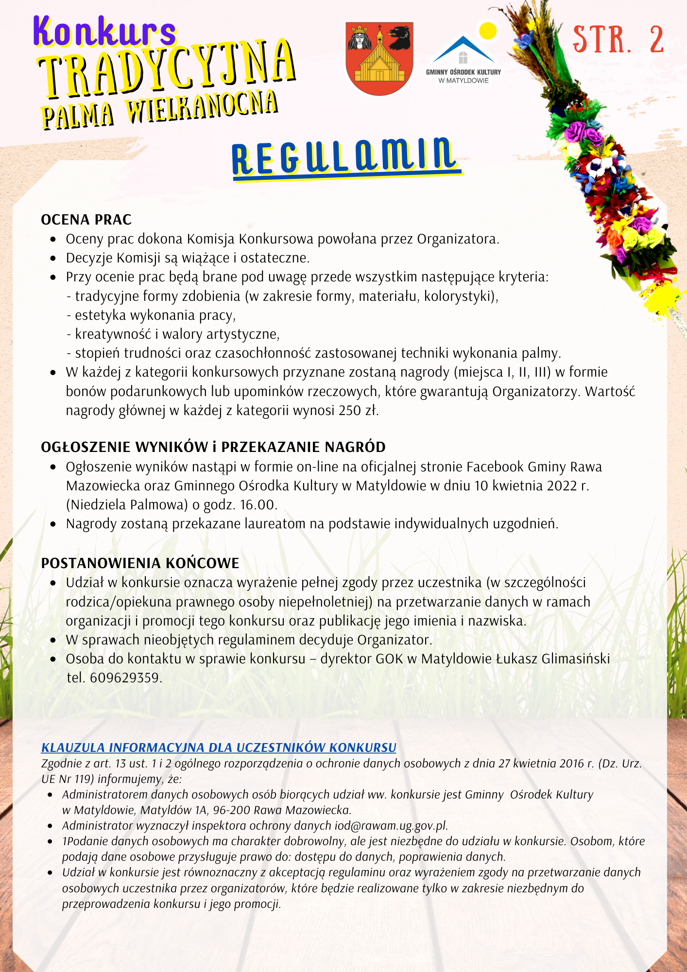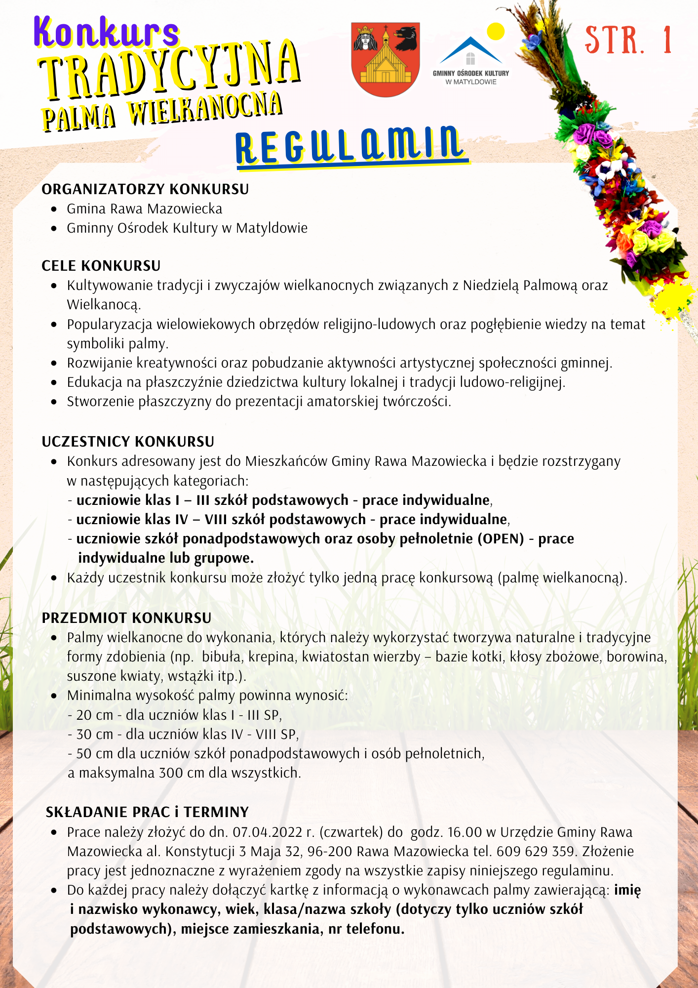 Konkurs dotyczy wykonania indywidualnych prac (palm wielkanocnych)najbliższych tradycji ludowo-obrzędowej naszego regionu. Nazgłoszenia/prace czekamy w budynku Urzędu Gminy Rawa Mazowiecka do 7kwietnia 2022 r. godz. 16.00. Szczegółowe informacje dostępne są wzałączonym regulaminie.