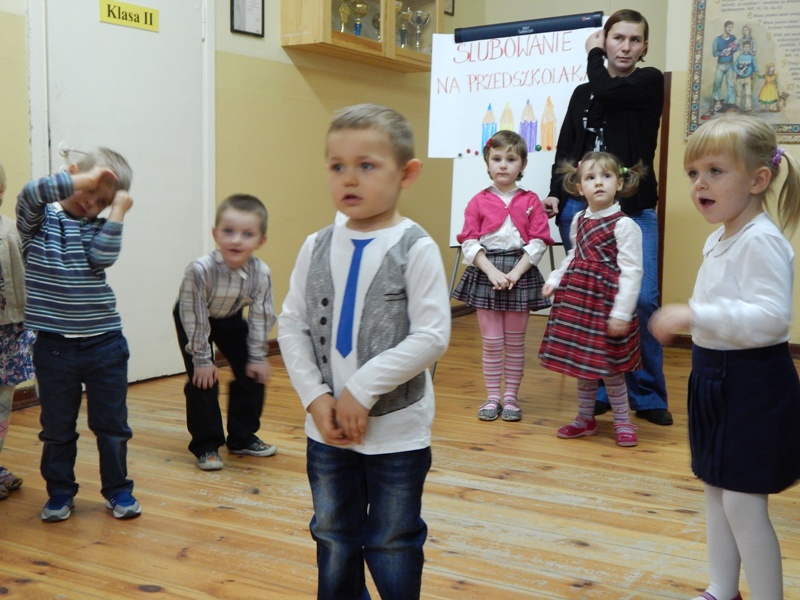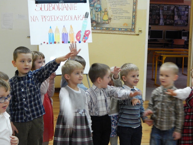 28 listopada przedszkolaki z grupy „Pszczółek” i „Żabek” złożyły uroczyste ślubowanie na przedszkolaka. Zaprezentowały poznane w przedszkolu wierszyki i piosenki, a następnie otrzymały pamiątkowe dyplomy z rąk Pani Dyrektor. Niespodzianką dla przedszkolaków był występ powitalny oraz upominki przygotowane przez starszych kolegów z grupy „Motylków”. Po części artystycznej dzieci i rodzice wraz z wychowawcami udali się na słodki poczęstunek.