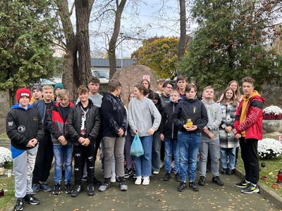 Na zdjęciu znajduje się grupa uczniów klasy VII i VIII na tle napisu " Żołnierze wyklęci"